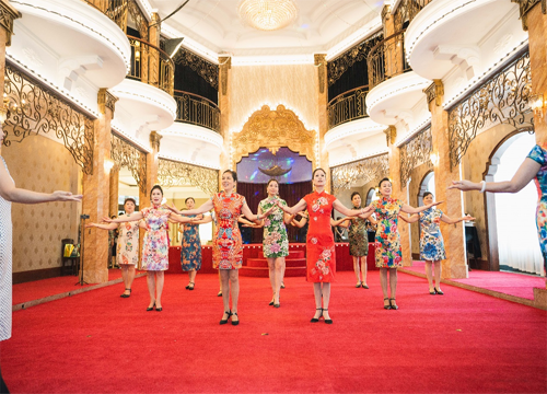 即使天气炎热,新青年们脸上还是洋溢着自信的微笑,一步一摇之间走出了百乐门风情万种,将东方气质与华贵挥洒到极致!